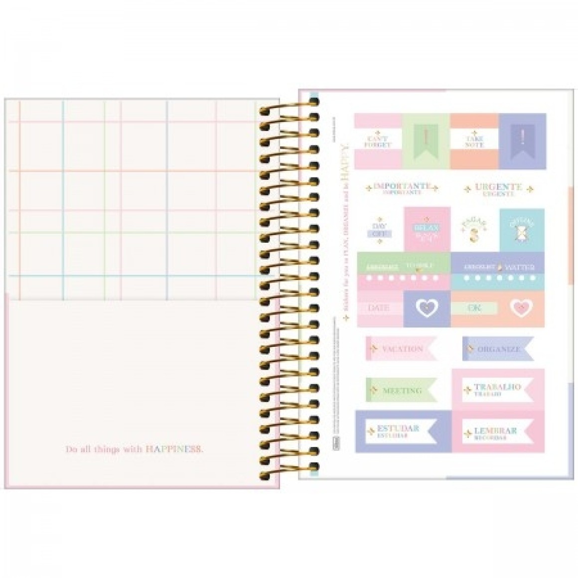 A Agenda Espiral Diária 12,9 x 18,7 cm Happy 2025 é ideal para a organização do dia a dia. O produto, com visão de um dia por página, exceto sábado e domingo, e folhas para anotações, possui capa dura com parte interna decorada, adesivos, bolsa de papel e 176 folhas.