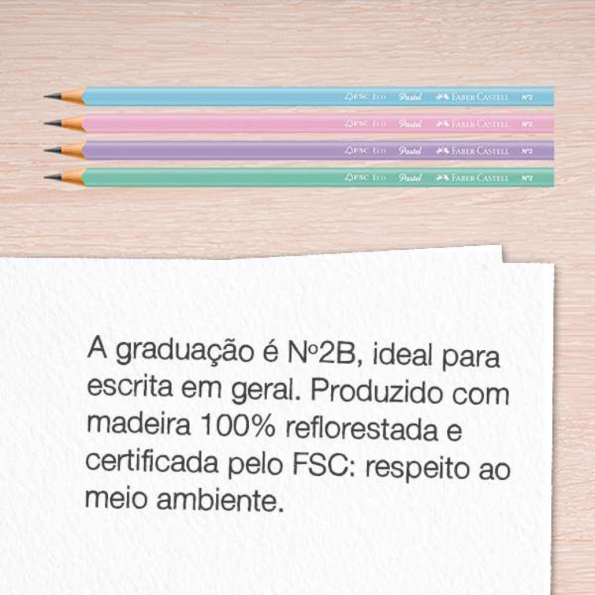 O Ecolápis Grafite Faber-Castell Tons Pastel traz o acabamento em cores pastel super fofas: azul bebê, rosa claro, lilás e verde-água. Além disso, sua ponta é max resistente, o que proporciona maior durabilidade ao produto e mais facilidade ao apontar. A graduação é Nº2B, ideal para escrita em geral. Produzido com madeira 100% reflorestada e certificada pelo FSC: respeito ao meio ambiente. ATENÇÃO! Não recomendável para crianças de até 3 (três) anos, por conter parte(s) pequena(s) que pode(m) ser engolida(s) ou aspirada(s). Produto atóxico e não perecível. Este produto pode ser reciclado.