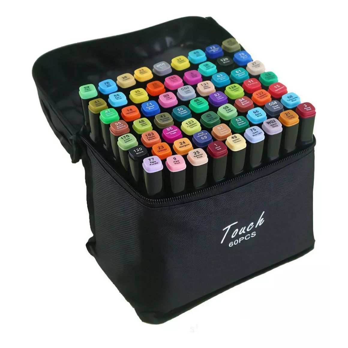 Cada caneta possui duas pontas, uma fina e uma mais grossa, oferecendo versatilidade para seu trabalho artístico. Com um total de 60 pontas, as possibilidades de criação são amplas. Os marcadores são à base de álcool, proporcionando aplicação suave e uniforme, e são livres de odores, adequados para uso até por crianças.