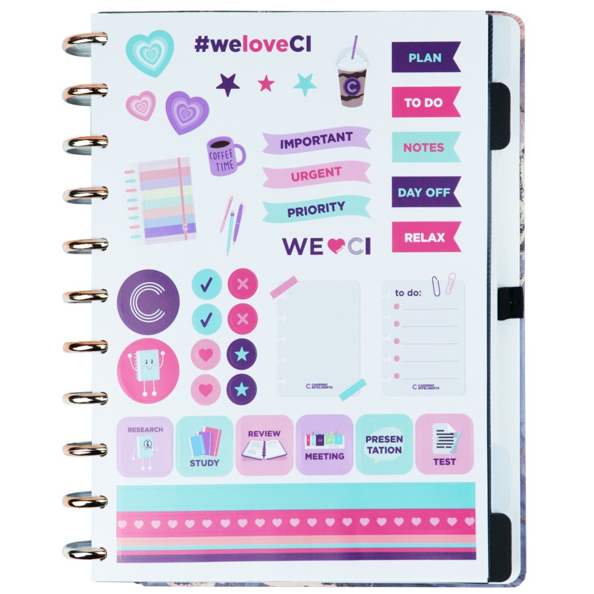 • Inteligine: Capa e contracapa rígidas, 01 folha de adesivos, 01 folha de instrução de uso e manuseio, com refis e acessórios da marca disponíveis no verso, 01 folha de identificação com calendário no verso, 50 folhas Lisas Offset 120g e 01 suporte com elástico para 01 caneta ou 01 lápis e discos M + elástico.